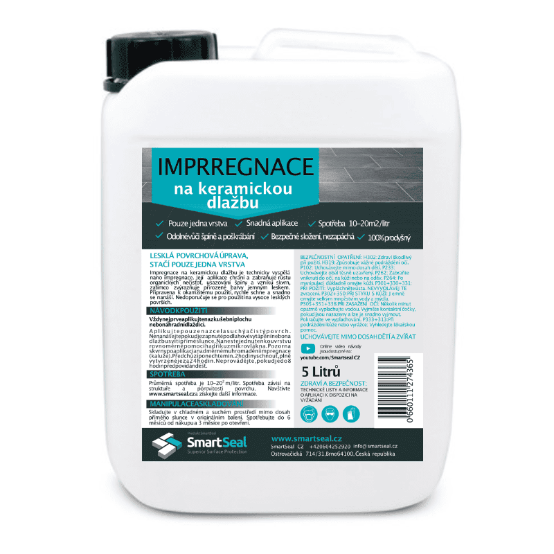 Impregnační nátěr na keramickou dlažbu Smartseal je odolný, prodyšný, ochranný impregnační nátěr pro vnitřní a vnější keramické a porcelánové dlaždice. Pomáhá předcházet znečištění a skvrnám na povrchu. I když se nejedná o barvu, působí jako zvýrazňovač barev a po zaschnutí zanechává jemný mokrý vzhled. Jeho hlavním účelem je usnadnit čištění a údržbu dlažby.