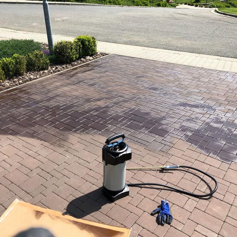 Aplikace čističe příjezdových cest Xtreme na zámkovou dlažbu